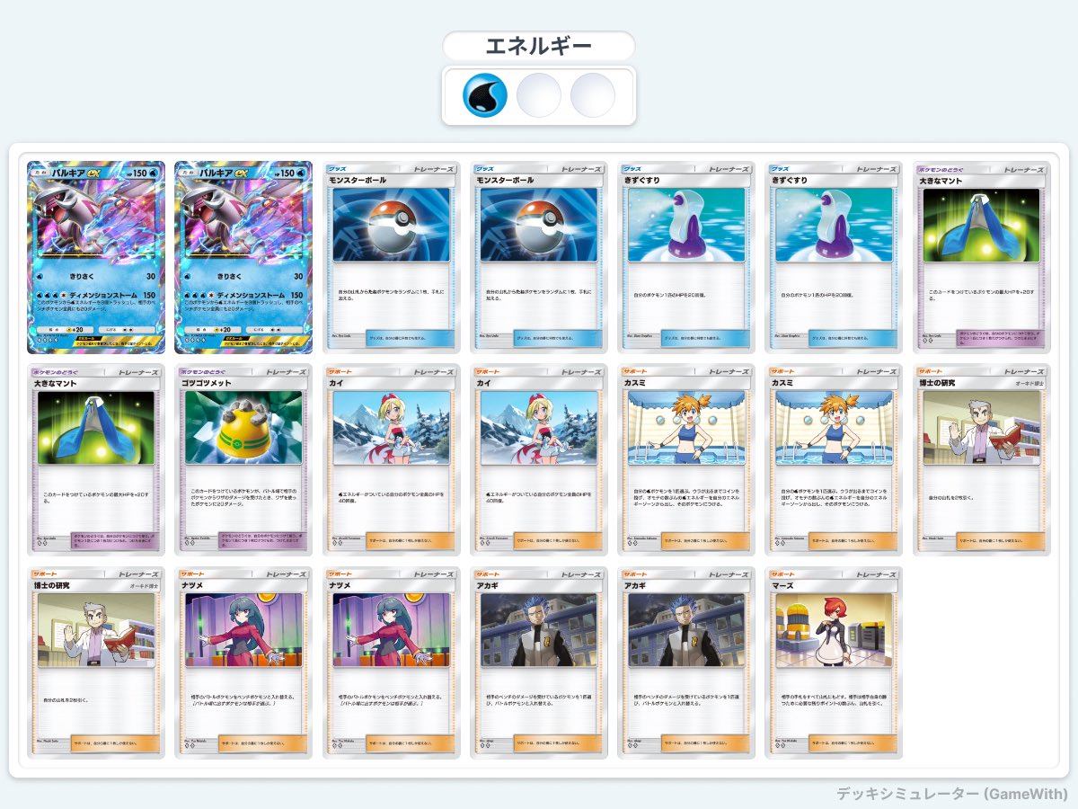 このデッキは「パルキアex」を中心に構築されており、技「ディメンションストーム」を活かした広範囲攻撃が特徴です。ベンチポケモン全体にダメージを与える効果を持つこの技は、相手の盤面を一気に崩すことが可能です。また、「カイ」や「カスミ」などのサポートカードによるエネルギー供給や手札補充を駆使し、安定した試合展開を実現します。さらに、「大きなマット」や「ゴツゴツメット」による防御性能も充実しており、攻守ともにバランスの取れたデッキです。