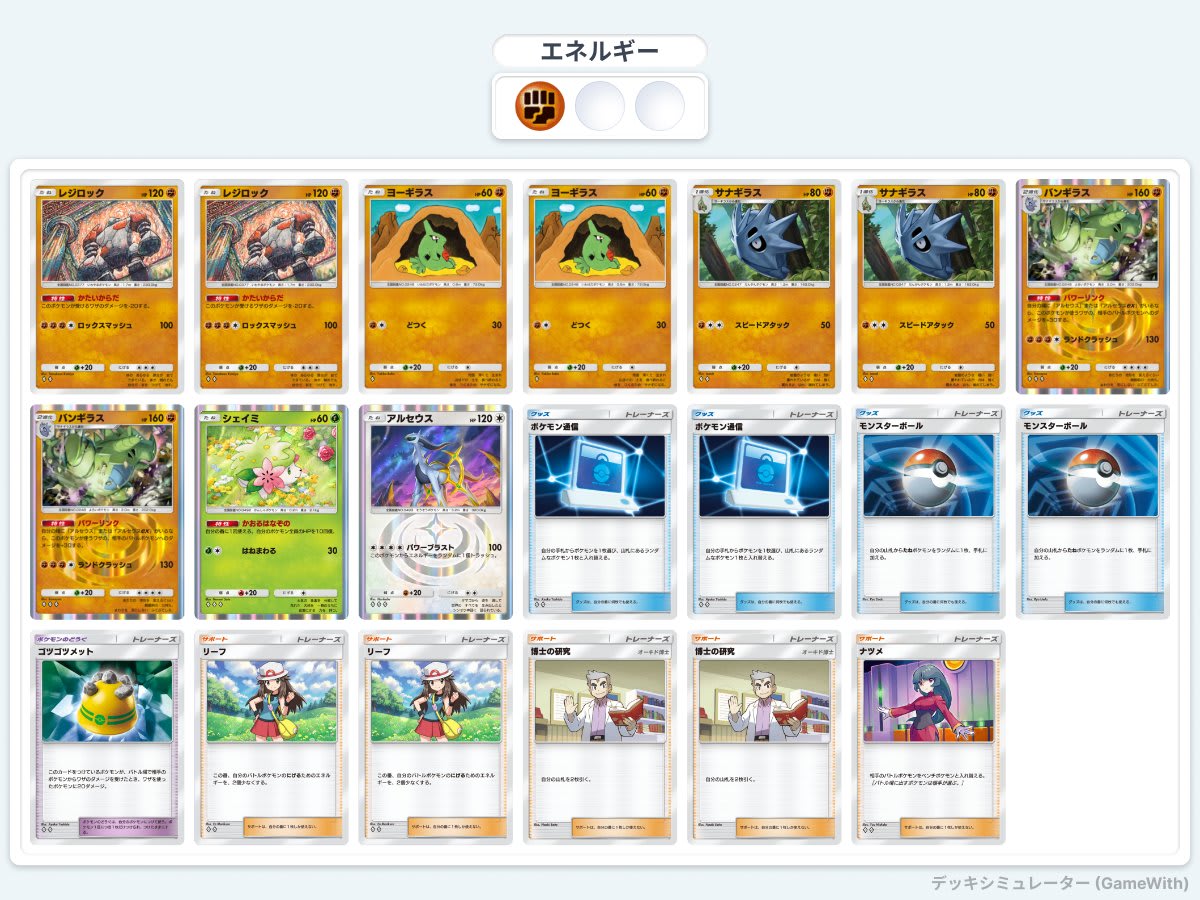 このデッキは、「レジロック」と「バンギラス」を中心に構築された格闘タイプの攻撃型デッキです。「レジロック」の特性「かたいからだ」による耐久力アップと、「バンギラス」の特性「パワーリンク」による火力強化が特徴です。「アルセウス」を場に出すことで、バンギラスのダメージがさらに底上げされます。また、「シェイミ」の特性「かおるはなぞの」を活用してHPを回復しつつ、長期戦でも安定した盤面を維持します。
