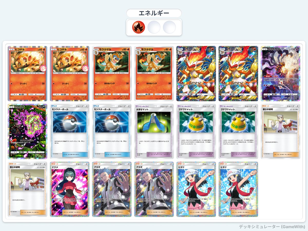 ヒコザルから始まる進化ラインはシンプルでありながら強力です。また、「博士の研究」や「ヒカリ」といったサポートカードによって手札補充やエネルギー加速が可能となり、安定した展開が期待できます。